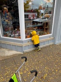 Arthur doesn't look inside every store front (and there are a few I try to distract him from) but he will always look to see if the toy train is running in the second-hand store or the row of toy trucks in the gift shop.